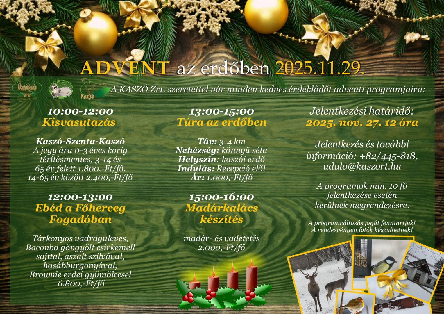« Összes esemény Advent az erdőben 2025. november 29. Esemény Navigation « Márton-napi Libaexpressz Mikulásjárat Kaszón » Tetszik! + Google Naptár+ iCal Exportálás Részletek Dátum: 2025. november 29. Esemény Categories: Karácsony és Advent, Kiemelt esemény Szervező Kaszó Zrt. Telefon: +36-82-352-303 E-mail: info@kaszort.hu Honlap: http://www.kaszort.hu/ Kapcsolódó Események Ismerkedj meg Rudolf legjobb barátaival a Pákozdi Pagonyban 2025. december 6. Erdők Nemzetközi Napja 2026-03-21|Ismétlődő Esemény (Az összes)An event every year that begins at 12:00am on of március, repeating indefinitely Lucanapi sasolás Dinnyésen 2025. december 13.